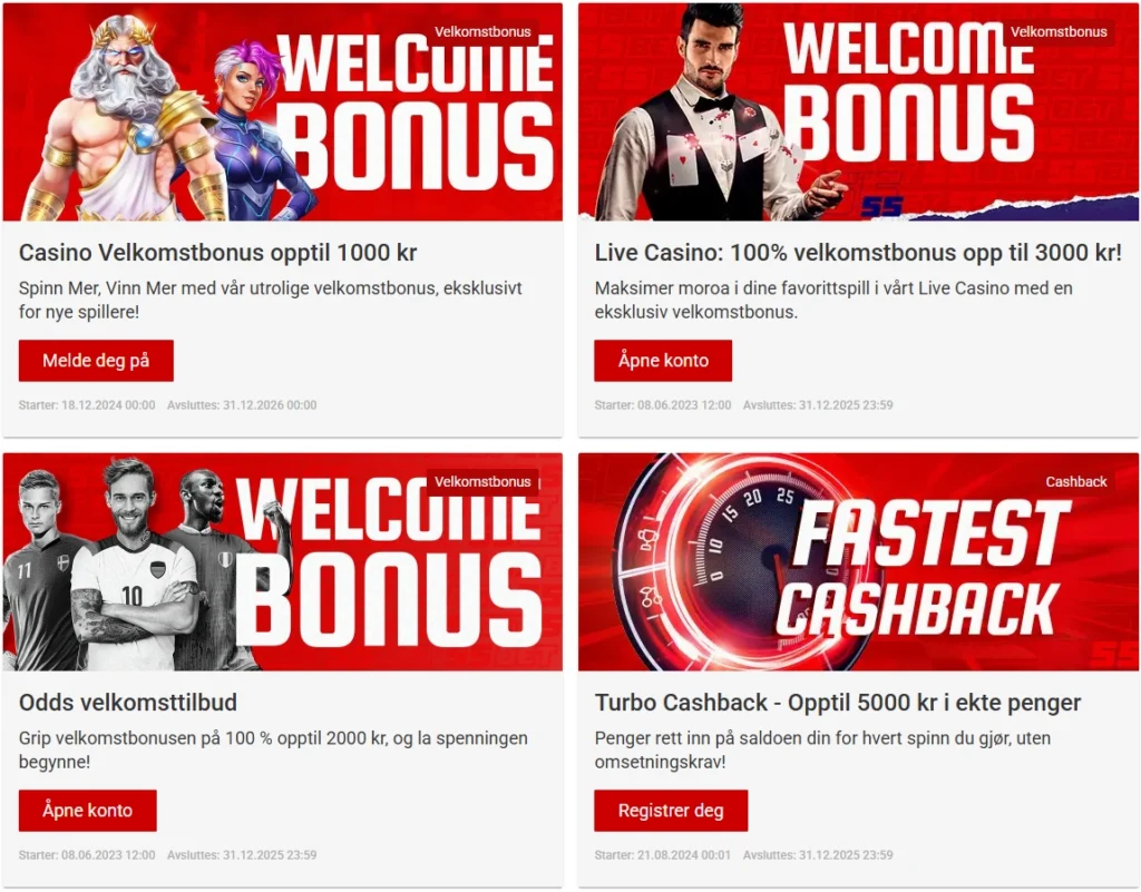 I tillegg har de Norges beste cashback med 55% tilbakebetaling i casinoet. Tilbakebetalingen utbetales også til deg på daglig basis opptil 5000 NOK per runde. Etter 5 000 NOK kan du melde deg på en ny runde samme dag!