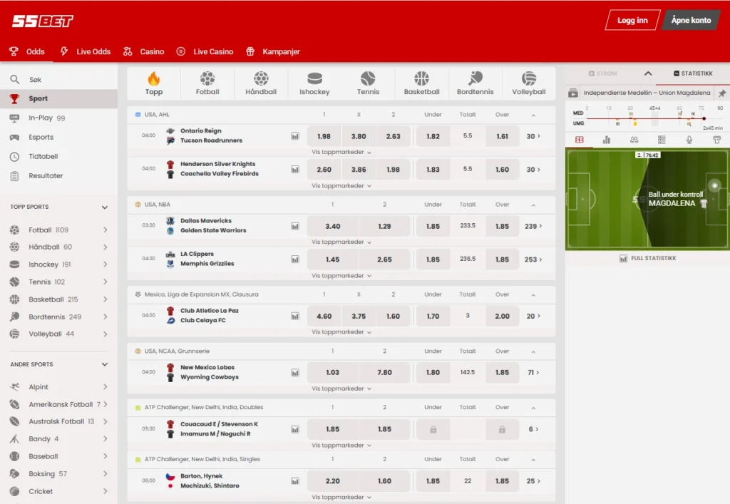 55BET tilbyr en omfattende sportsbook der du kan spille på et bredt spekter av sport og e-sport, både før kamp og live. Nettstedet dekker alt fra populære idretter som fotball, ishockey og basketball til nisjealternativer som futsal, rugby og dart. I tillegg finnes det et bredt utvalg av e-sport, inkludert CS2, Valorant og League of Legends, med spesifikke regler for hva som skjer hvis et lag forlater walkover eller hvis det oppstår tekniske problemer.
