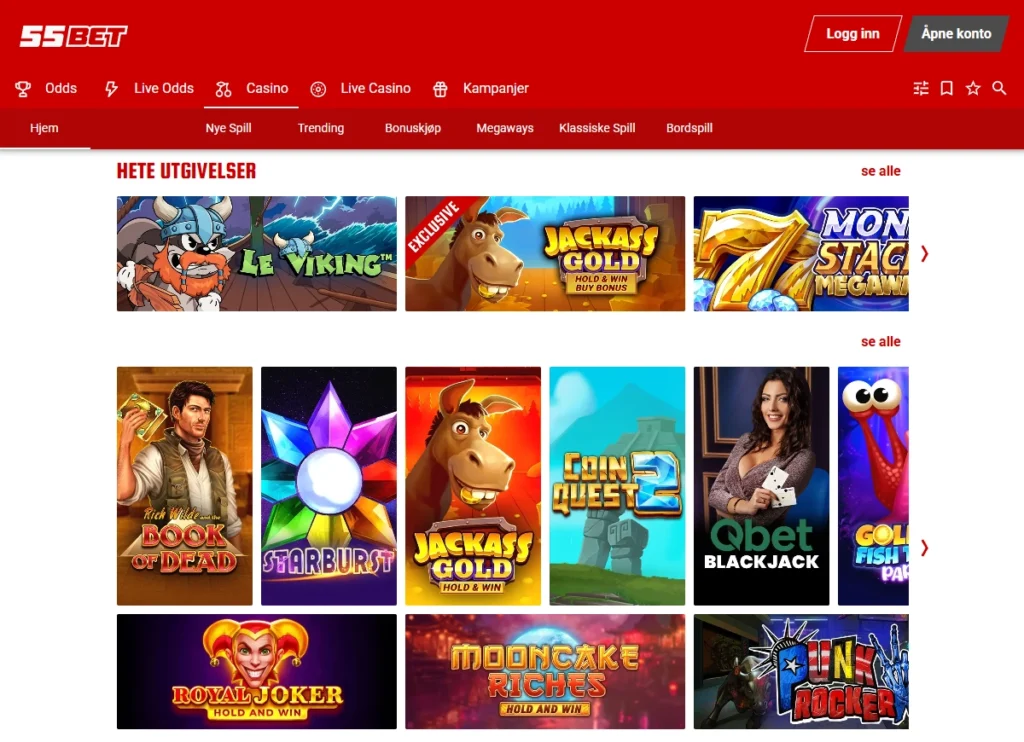Dette er automater med høyt vinnerpotensial og funksjoner som ofte appellerer til de mest aktive spillerne. I tillegg kjører 55BET en unik 55 % cashback på alle slot-spinn, som gjør at du får ekstra mye spenning ut av hvert eneste spinn. Sammenlignet med tradisjonelle jackpotmaskiner kan du i Bonus Buy- og Megaways-spillene oppleve intense, høyvolatile runder der gevinstene potensielt kan bli svært store.