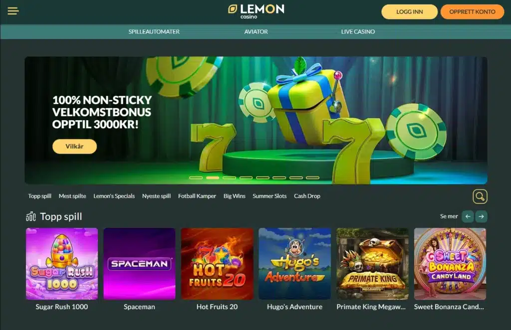 Lemon Casino utmerker seg med et unikt tema inspirert av sitroner. Den friske kombinasjonen av grønne og gule toner, animasjoner av dansende sitroner og et lekent design gjør at casinoet skiller seg ut i mengden. Nettsiden er intuitiv, med en hovedmeny som gir rask tilgang til kategorier som Casino, Live Casino, Jackpotspill og Andre spill. Spillene er oversiktlig gruppert og filtreringsmulighetene gjør det enkelt å finne akkurat det du leter etter.